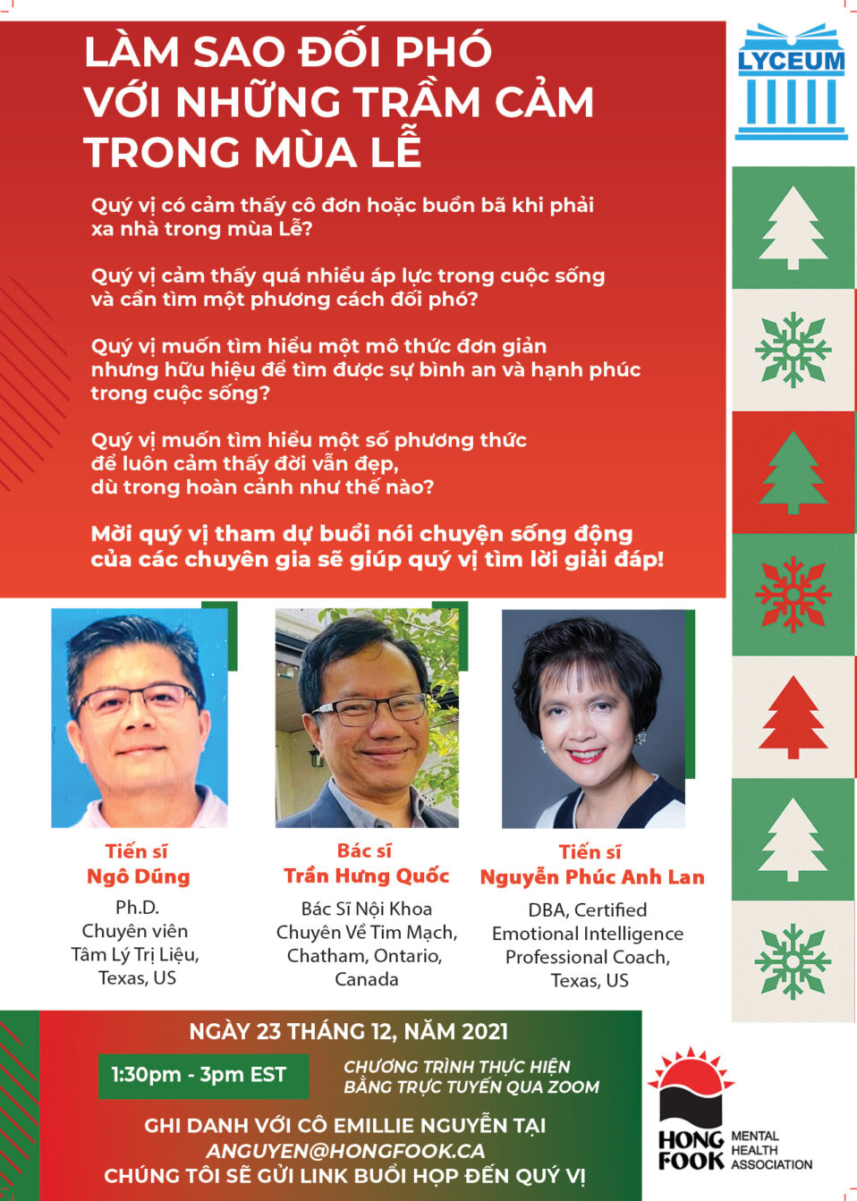Date: November 25, 2021 Time: 1:30pm – 3:00pm EST Location: Online Presenter: Ts. Nguyễn Phúc Anh Lan và học xá Lyceum Canada To register, please email Emillie Nguyen at enguyen@hongfook.ca...