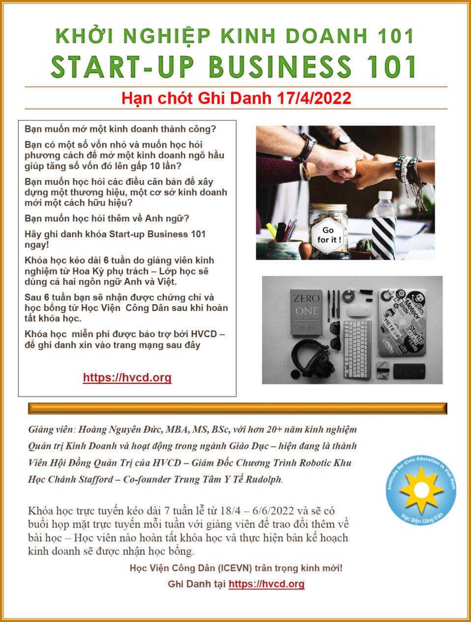 Các khoá học Mùa xuân 2022 Ghi danh tại: https://hvcd.org Công Dân Học Khóa Công Dân Học CDH4301-122 sẽ được khai giảng ngày 21 tháng 2, 2022. Thời hạn ghi danh: 21/01 – 21/02/22. Học trình là 10 tuần, từ 21/02 – 25/04/22. Khởi Nghiệp Kinh Doanh Căn Bản Khóa…...